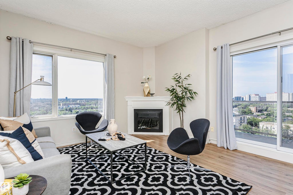Corner penthouse suite with panoramic views of the river valley and downtown skyline, perfect for professionals working at the U of A or downtown. Sunlight floods the space from south and west-facing windows, creating a warm, inviting atmosphere. Thoughtfully designed with two spacious bedrooms on opposite sides for added privacy. The south-facing primary offers a 4-piece ensuite, double closet, and private patio with storage room. The second bedroom features a walk-in closet, and full bath. The open-concept kitchen includes a breakfast bar and flows into a bright living area with a gas fireplace and access to a second large patio with gas BBQ hookup. In-suite laundry with storage, titled underground parking, and an on-site fitness room complete the package. A quiet, well-managed building with incredible potential in an unbeatable location with two patios!